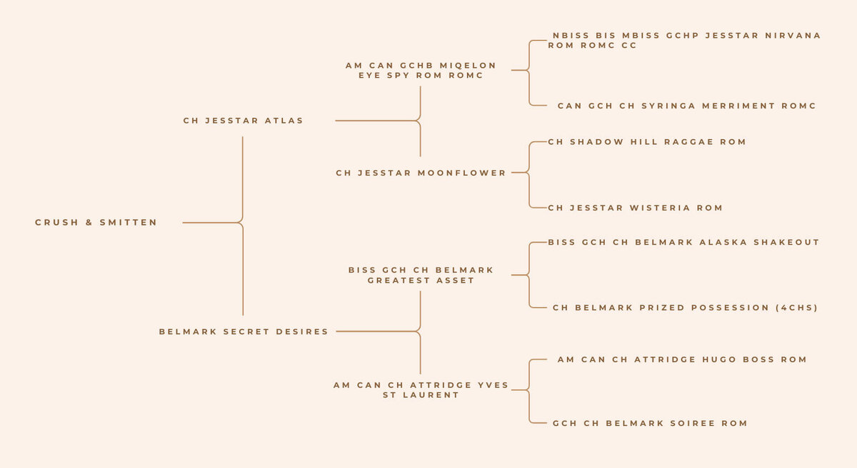 Sister to Crush above, Smitten was our pick from this litter. She has all the right parts in all the right places and is dead in the center of the chart. This girl is very sweet, giving kisses every chance she gets. Such a cutie. We are very luck to be surrounded by such beautiful creatures. Excited about 2026